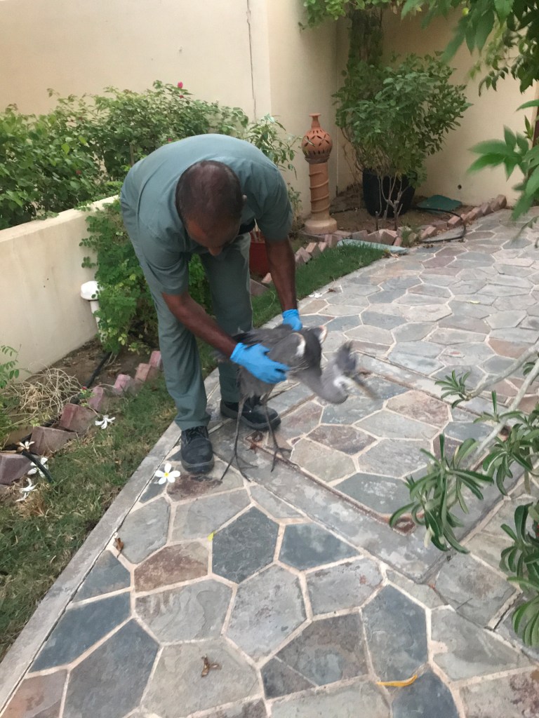 Those of us who don’t believe in authorities, who think that bureaucracies are just bumbling bastions of red tape (I admit I was one of them) will be pleasantly surprised at the speed at which Dubai Municipality acted. The van came after an hour or so (dreadful traffic jams at this time) and the assistant gently lifted the bird. It was so weak by this time that it did not have the strength to peck, .